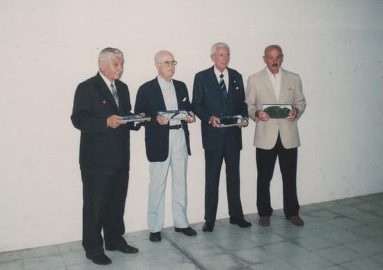Cuando se inaugura la cancha “cerrada” siendo Presidente don Plácido Crego y por iniciativa de don Eduardo González, que era en ese momento el “cantinero” del Club. se hicieron las gestiones para que el día de la inauguración, el primer partido lo hicieran los chicos que estaban todos los días, las parejas fueron así; Perico Benazzi-Pillín Versacci y Tito Benazzi-Alfredo Chiste.—Cuando en Enero 2001 se cumplieron los 60 años de la inauguración de la cancha cerrada, recibimos un reconocimiento por ser los primeros que habíamos jugados en el año 1941.